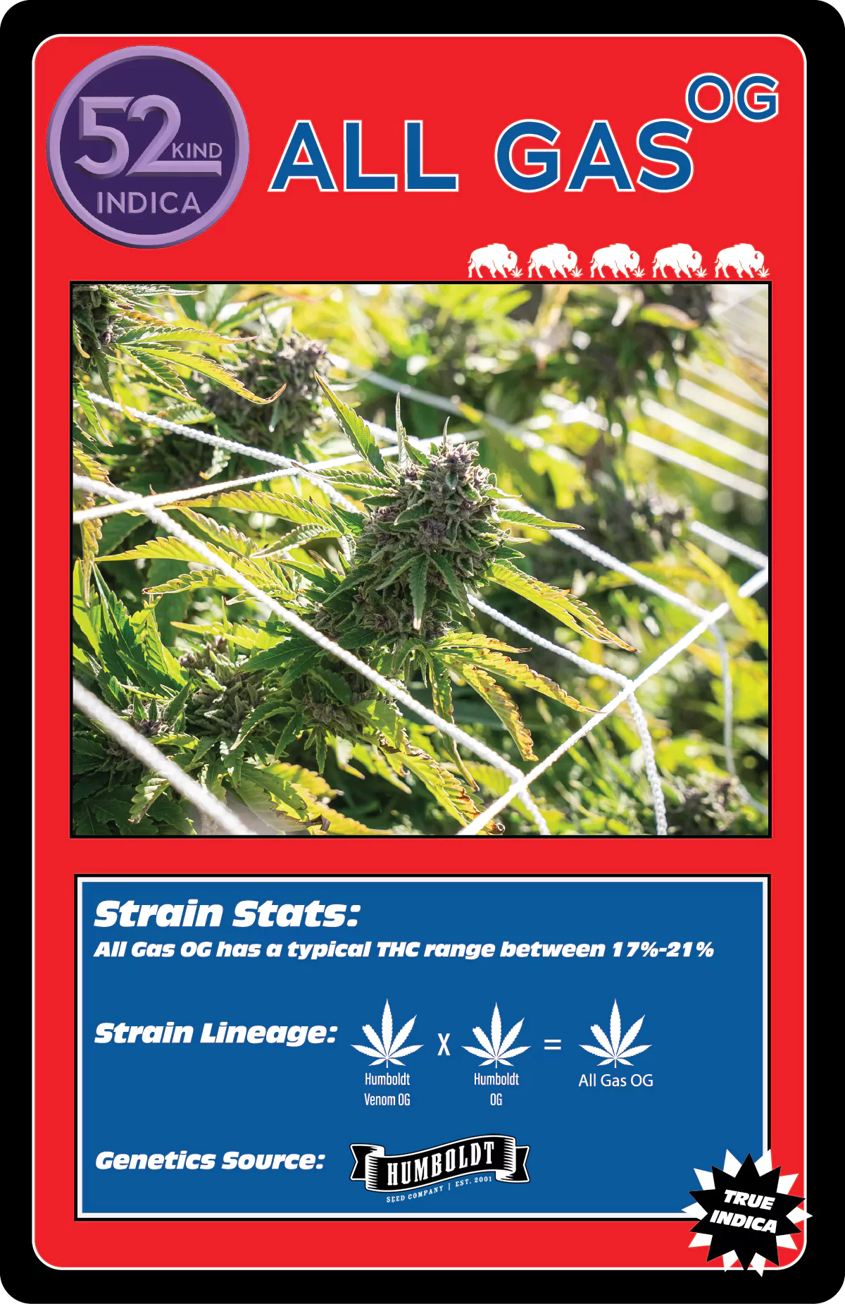 All Gas OG is named for the pungent fuel aroma that fills the air whenever you open a pack. The tell-tale scent is an indication of the exotic flavor profile. Inhaling the smoke offers an amazing combination of pine and diesel notes with a lovely, subtle, earthy undertone. The piney-orange flavor is quite unique and introduces a nice complexity to the strain. Ideal for evening use, the effects of All Gas OG are true to indica expectations, melting away stress and delivering a sense of relaxation and euphoria.